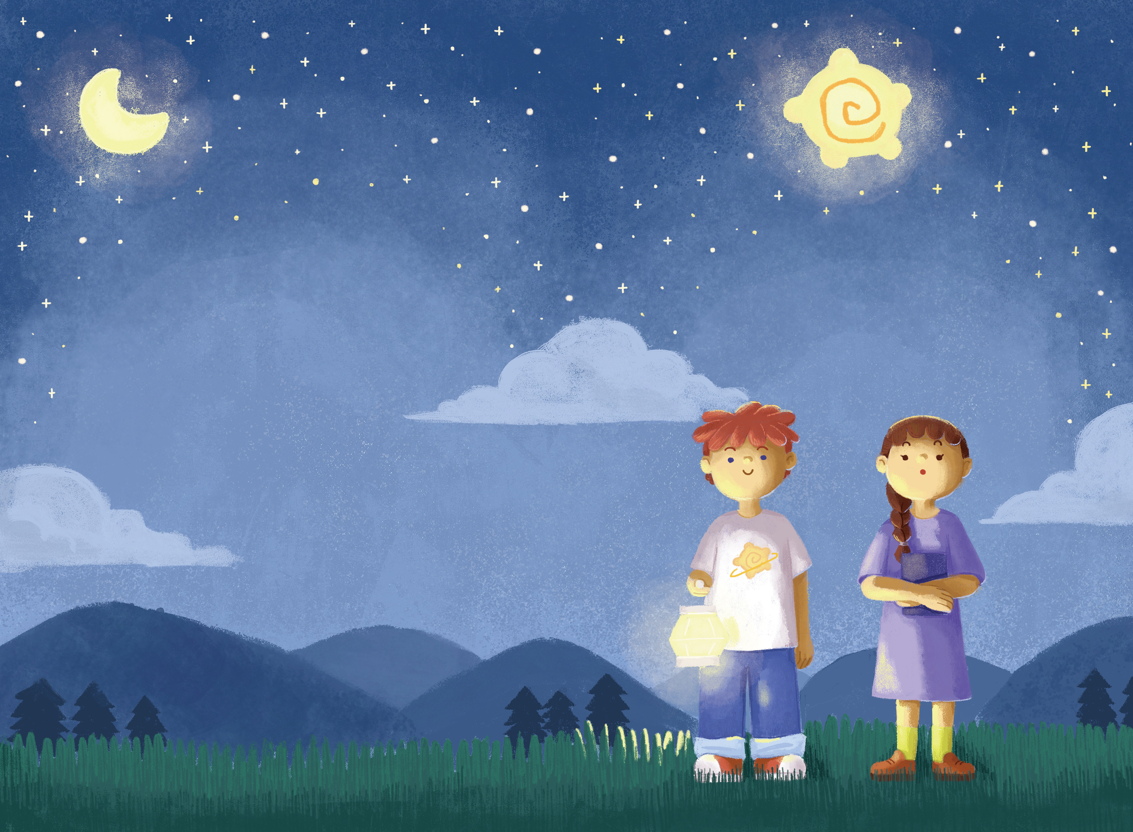 I realized I had encountered a scam only after I finished the illustrations. Fortunately, I didn't lose any money. I actually quite like the illustrations I created. In simple terms, it's a story about two kids, LUNA and NYRA. I'm not sure what the story is about, but to put it simply, the stars are a key element in the story. Based on the description provided by the other party, it seems like the stars are supposed to fall, so I made the stars look quite plump.